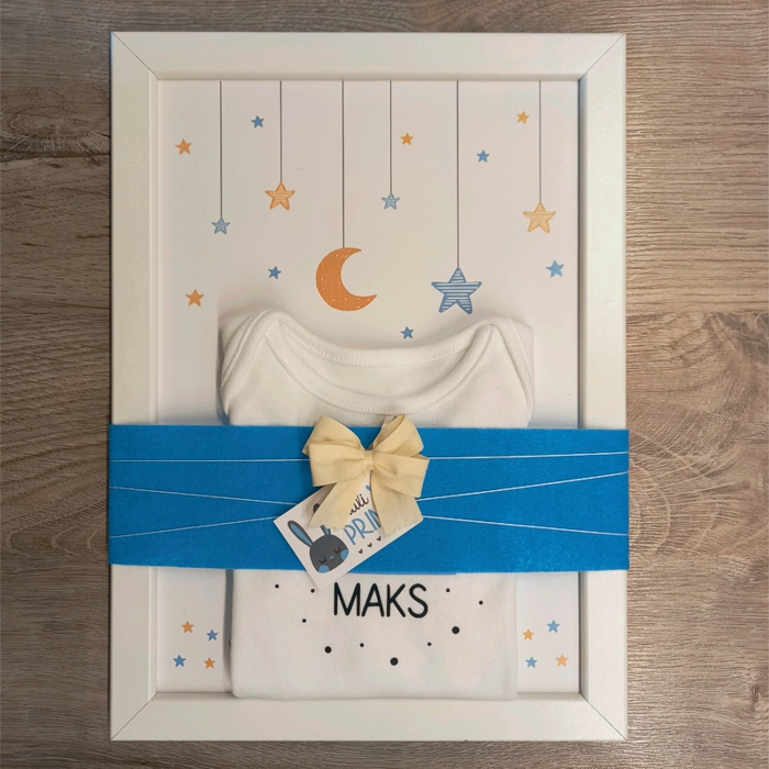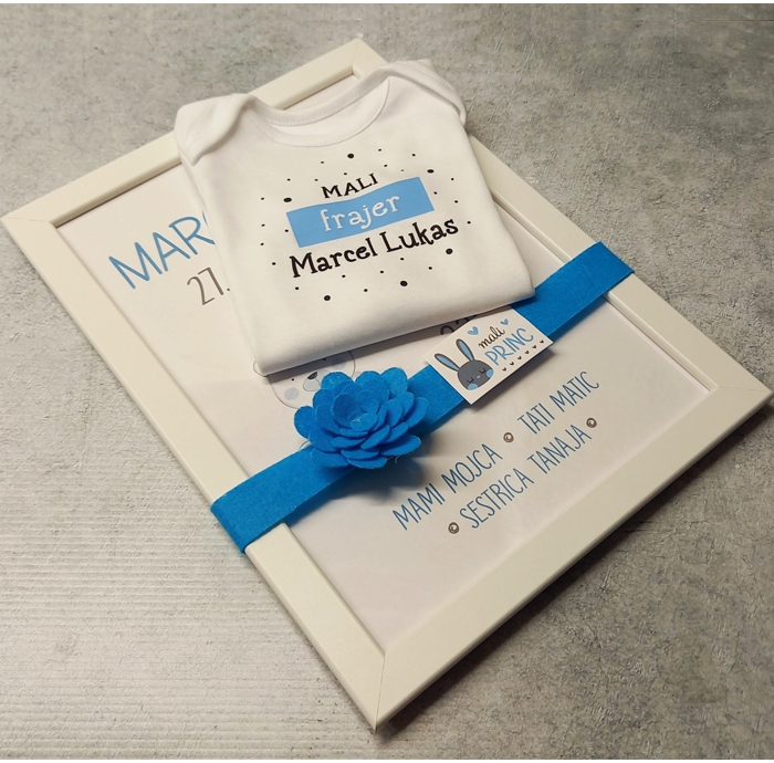 Čudovita ideja za darilo! Ljubek darilni komplet, ki bo navdušil mamico in ostal v trajen spomin trenutka rojstva malega fantka. Nadvse prisrčno dekoriranemu okvirčku je priložen izbran bombažni bodi.