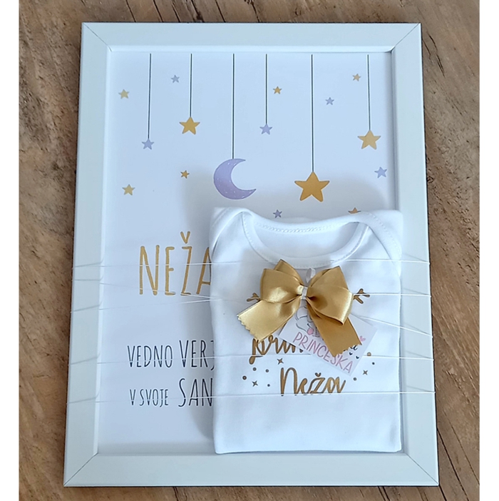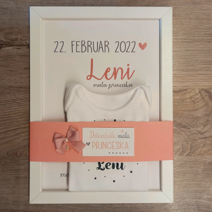 Čudovita ideja za darilo! Ljubek darilni komplet, ki bo navdušil mamico in ostal v trajen spomin trenutka rojstva male deklice. Nadvse prisrčno dekoriranemu okvirčku je priložen izbran bombažni bodi.